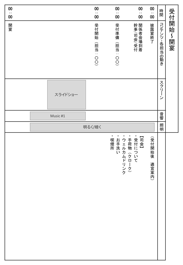 幹事メンバーが集まる機会が少ない場合や幹事以外の人が司会をやるのであれば, 個人的には台本は作っておいたほうがいいと思います.受付時(開始前), オープニング, コンテンツ(余興), エンディングの各パートで, どんな話をするのかスクリーン/音響/照明はどういう状態なのか, ちゃんと作っておけば司会だけでなく幹事全員が安心して当日動けるはずです.